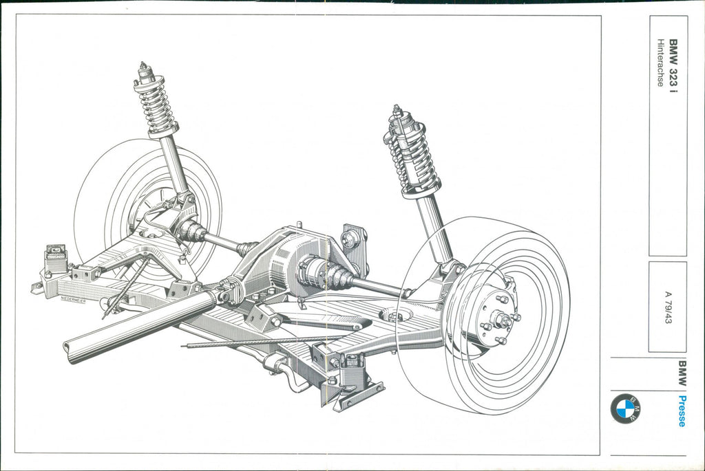 Spring strut semi-trailing arm rear axle with torque support on final drive housing, disc brake, stabilizer bar.