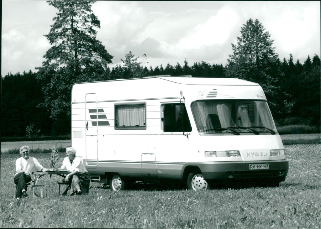 A couple relaxes in front of a Hymermobil B 544 Classic parked in nature