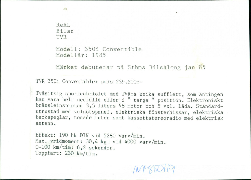 TVR 350i Convertible: price SEK 239,500 Two-seater sports convertible with TVR's unique canopy, which can either be fully recessed or in a low fuel injected 3.5 liter liter V8 engine and 5 turns.