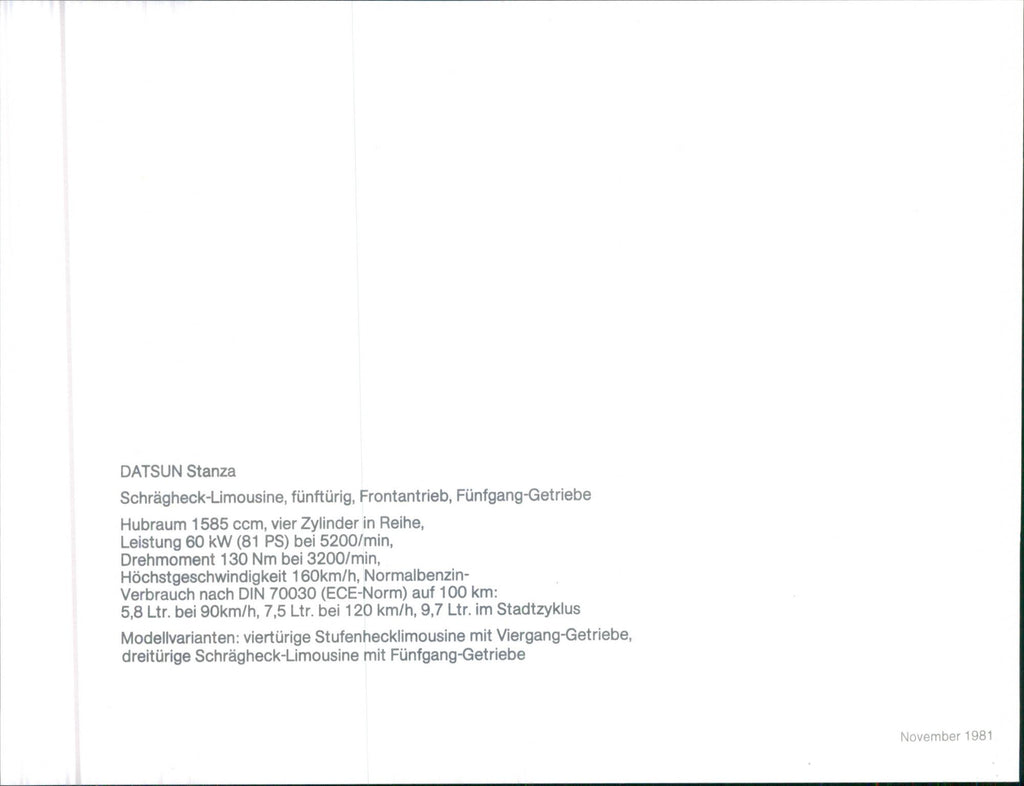 Datsun Stanza. Schraggheck limousine, three-wheel drive, front drive, five-gear transmission hub 1585 ccm four-cylinder in range, power 60 kW (81 hp) at 5200 / min, torque 130 Nm at 3200 / min, maximum speed 160 km / h, normal petrol to DIN 70030 (ECE standard) at 100 km: 5.5 Ltr. at 90 km / h, 7.4 ltr. at 120O km / h, 9.7 In the city cycle model variants: four-stage four-wheel-drive sedan with four-speed gearbox, five-speed diagonal sedan with five-speed gearbox November 1981.