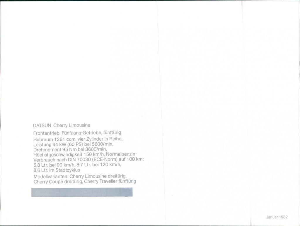 Datsun Cherry sedan front-wheel drive, five-speed gearbox, five-door displacement 1261 cc, four cylinders in line, power 44 kW (60 hp) at 5600 / min, torque 95 Nm at 3600 / min, maximum speed 150 km / h, normal gasoline consumption according to DIN 70030 (ECE standard) at 100 km: 5.8 liters at 90 km / h, 8.7 liters at 120 km / h, 8.6 liters in city cycle. Model variants: Cherry sedan three-door, Cherry Coupé three-door, Cherry Five-door Traveler.