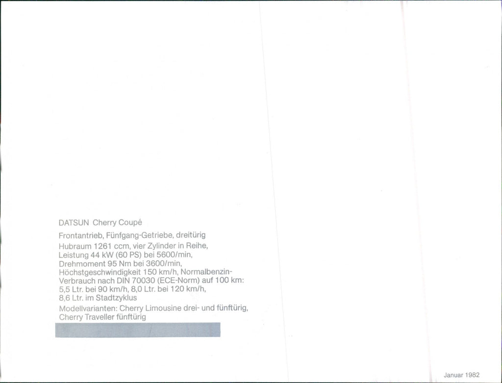 DATSUN Cherry Coupé front-wheel drive, five-speed gearbox, three-door displacement 1261 cc, four cylinders in line, power 44 kW (60 hp) at 5600 / min, torque 95 Nm at 3600 / min, maximum speed 150 km / h, normal gasoline consumption according to DIN 70030 (ECE standard) at 100 km: 5.5 liters at 90 km / h, 8.0 liters at 120 km / h, 8.6 liters in the city cycle. Model variants: Cherry sedan with three and five doors, Cherry Traveler five-door.