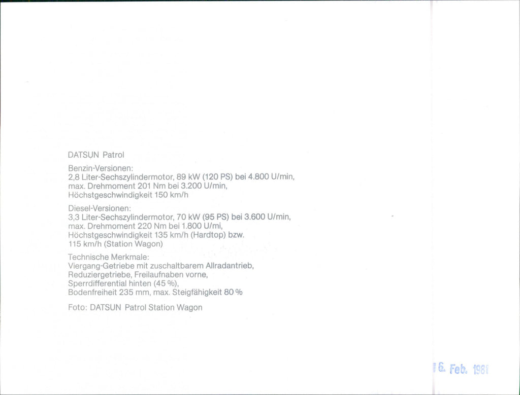 Datsun Patrol petrol versions: 2.8 liter six-cylinder engine, 89 kW (120 hp) at 4,800 rpm, max. Torque 201 Nm at 3,200 rpm, maximum speed 150 km / h Diesel versions: 3.3 liter six-cylinder engine, 70 kVW (95 hp) at 3,600 rpm, max. Torque 220 Nm at 1,800 rpm, maximum speed 135 km / h (hard top) or 115 km / h (station wagon) Technical features: four-speed gearbox with switchable all-wheel drive, reduction gear, freewheel hubs at the front, limited slip differential at the rear (45%), ground clearance 235 mm, max. Gradeability 80% Photo: DATSUN Patrol Station Wagon.