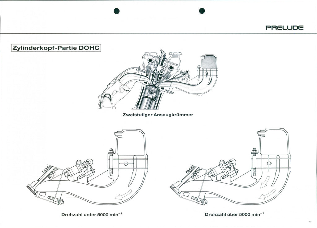 Drawing of Honda Prelude's cylinder head section DOHC. Two-stage intake manifold, Speed less than 5000 min-1, Speed over 5000 min-1.
