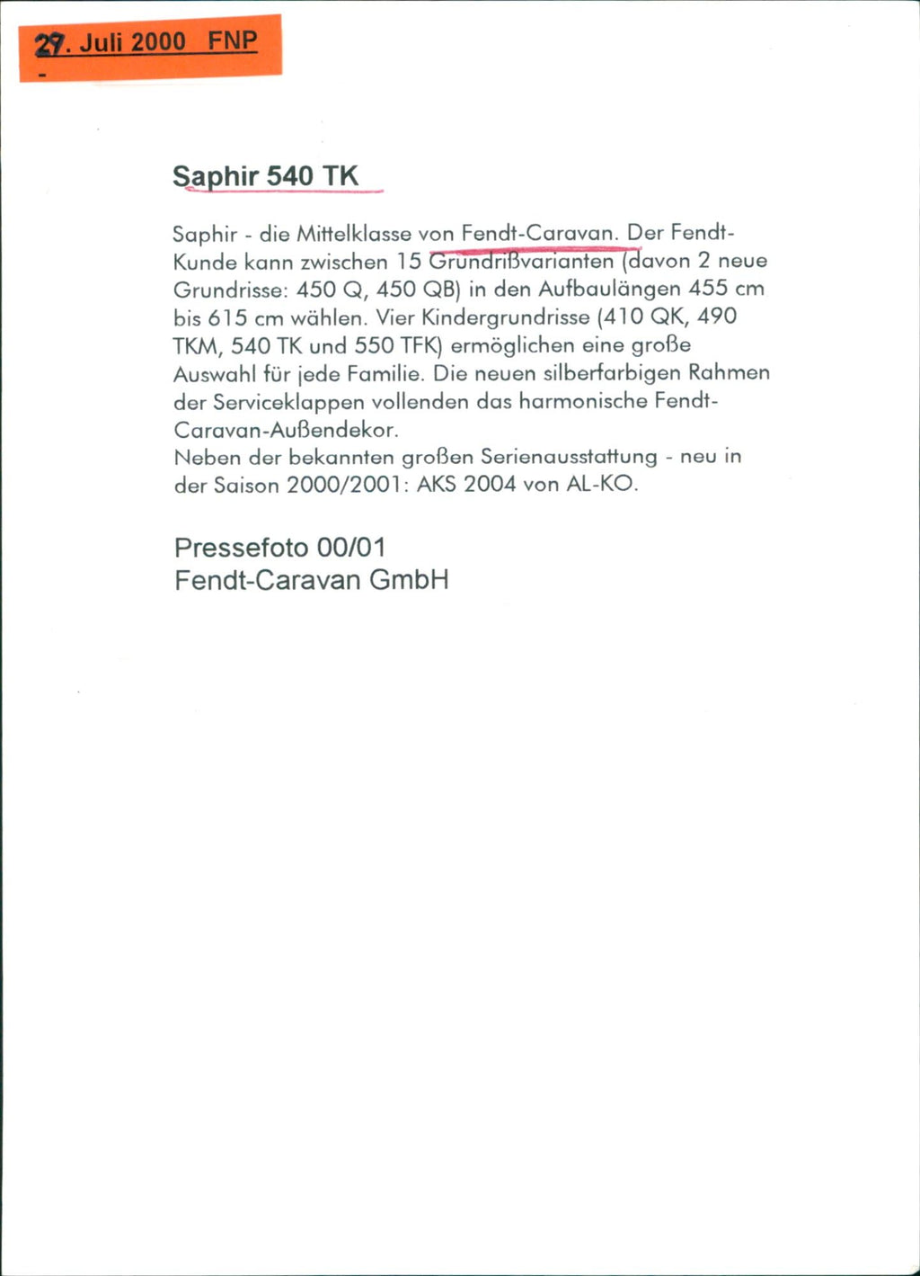 Fendt Saphir 540 TK caravan - Vintage Photograph