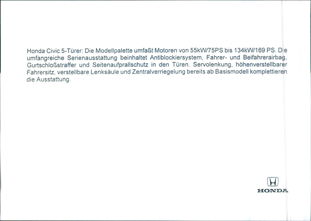 Honda Civic 5-door: The model range includes engines from 55kW / 75PS to 134kW / 169 HP. The extensive standard equipment includes anti-lock braking system, driver and front passenger airbags, belt buckle tensioners and side impact protection in the doors. Power steering, height-adjustable driver's seat, adjustable steering column and central locking complete the equipment from the basic model.