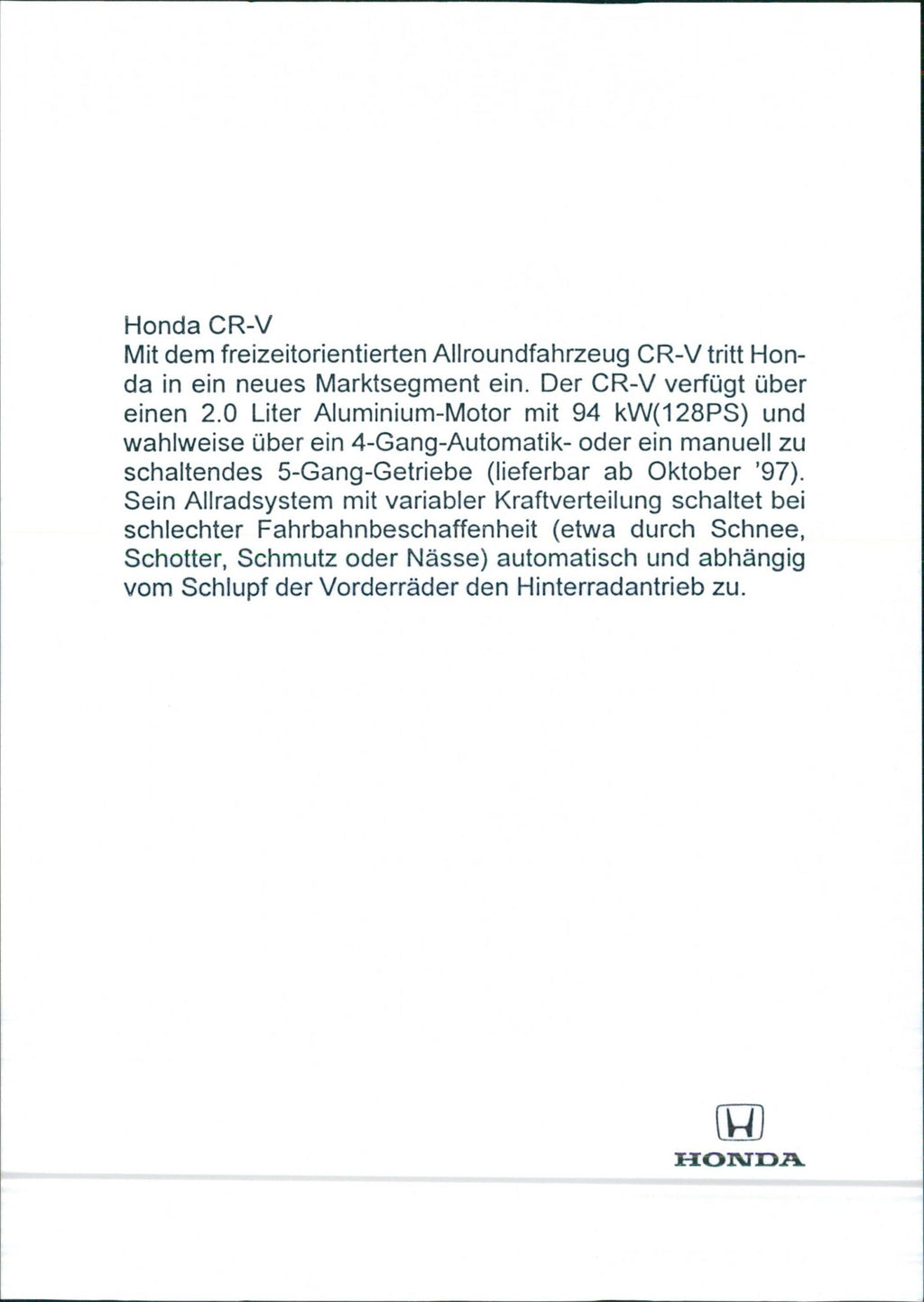 Honda CR-V With the leisure-oriented all-round vehicle CR-V, Honda is entering a new market segment. The CR-V has a 2.0 liter aluminum engine with 94 kW (128PS) and either a 4-speed automatic or a manually shiftable 5-speed gearbox (available from October '97).