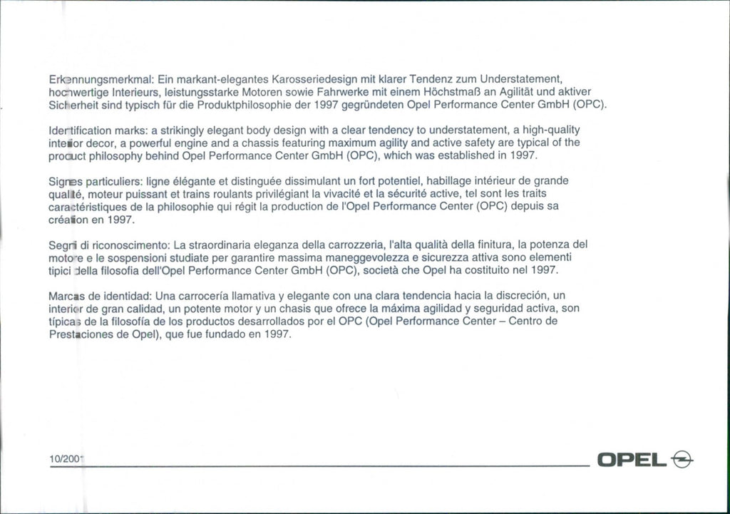 Opel Zafira 2001 Identification marks: a strikingly elegant body design with a clear tendency to understatement, a high-quality interior decor, a powerful engine and a chassis featuring maximum agility and active safety are typical of the product philosophy behind Opel Performance Center GmbH (OPC), which was established in 1997.