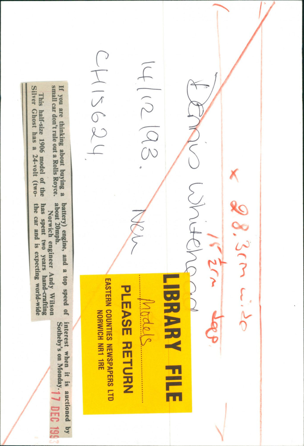If you are thinking about buying a battery) engine, a small car don't rule out a Rolls Royce. about 20mph. nd a top speed of interest when it is auctioned by Sotheby's on Monday 17 DEC 199 Norwich engineer Andy Wilson This half-size 1906 model of the has spent two years hand-crafting Silver Ghost has a 24-volt (two- the car and is expecting world-wide If you are thinking about buying a battery) engine, a small car don't rule out a Rolls Royce. about 20mph. nd a top speed of interest when it is auctioned by Sotheby's on Monday 17 DEC 199 Norwich engineer Andy Wilson This half-size 1906 model of the has spent two years hand-crafting Silver Ghost has a 24-volt (two- the car and is expecting world-wide