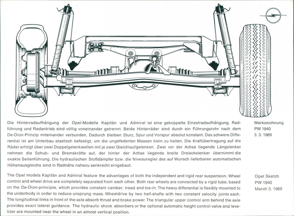 The Opel models Kapitän and Admiral feature the advantages of both the independent and rigid rear suspension. Wheel Opel Sketch control and wheel drive are completely separated from each other. Both rear wheels are connected by a rigid tube, based PW 1940 on the De-Dion-principle, which provides constant camber, tread and toe-in. The heavy differential is flexibly mounted to the underbody in order to reduce unsprung mass. Wheeldrive by two half-shafts with two constant velocity joints each.