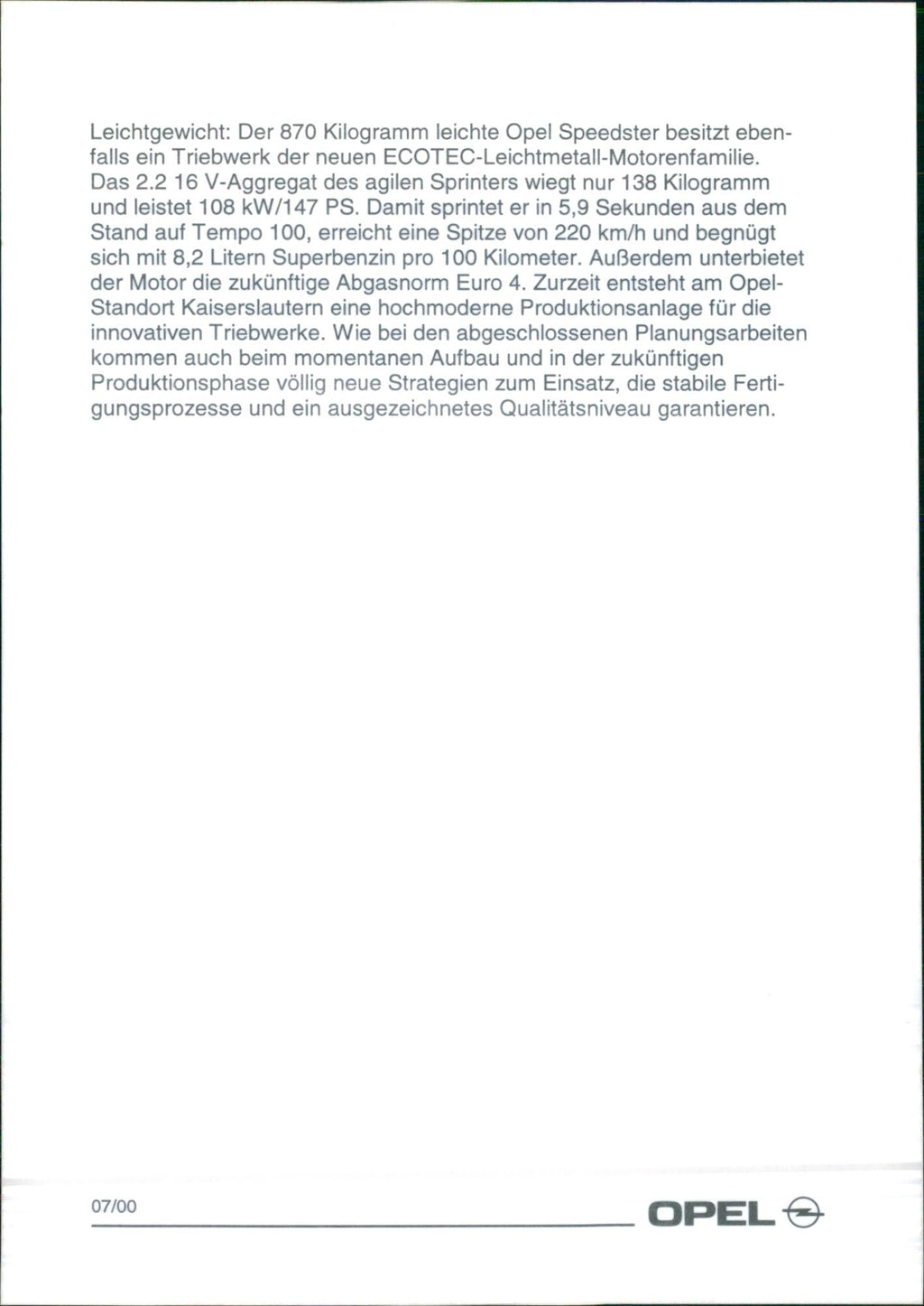 Lightweight: The 870 kilogram Opel Speedster also has an engine from the new ECOTEC light alloy engine family.