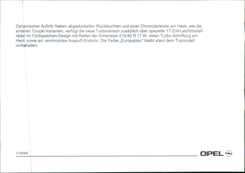 In addition to darkened taillights and a chrome trim strip at the rear, like the other coupé variants, the new turbo version also has special 17-inch light-alloy wheels in five-spoke design with 215/40 R 17 W tires, a turbo -Lettering at the rear and a chrome exhaust tailpipe.