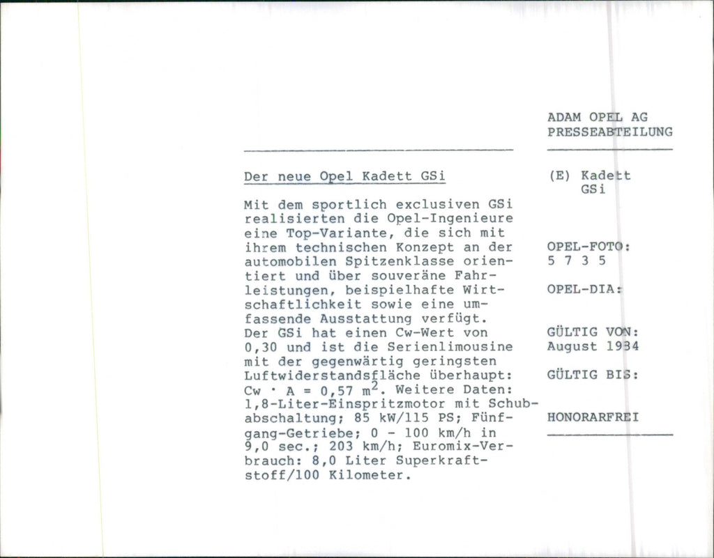 The new Opel Kadett GSi, With the sporty, exclusive GSi, the Opel engineers implemented a top version, which is based on the top-class automobile with its technical concept and has superior driving performance, exemplary economy and extensive equipment. The GSi has a Cd value of 0.30 and is the production sedan with the smallest air resistance area currently available: Cw • A = 0.57 m². Other data: 1.8 liter injection engine with overrun fuel cut-off; 85 kW / 115 hp; Five-speed transmission; 0 - 100 km / h in 9.0 sec .; 203 km / h; Euromix consumption: 8.0 liters of super fuel / 100 kilometers.
