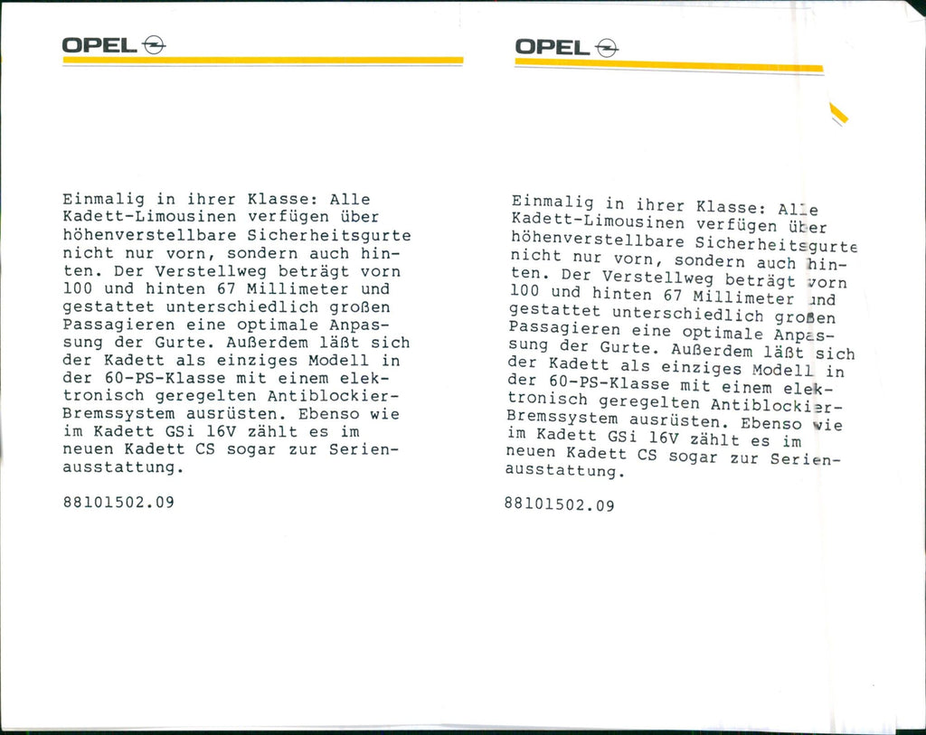 Unique in its class: All Kadett limousines have height-adjustable seat belts not only at the front but also at the rear. The adjustment range is 100 millimeters at the front and 67 millimeters at the rear and allows passengers of different sizes to adjust the belts optimally.