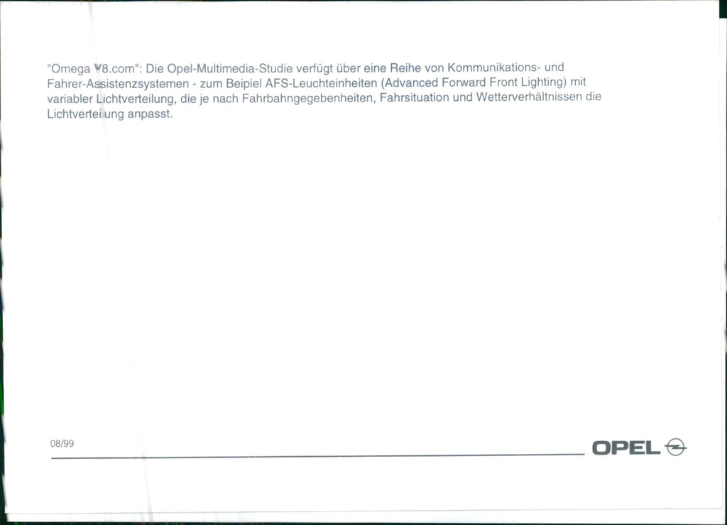 "Omega V8.com": The Opel multimedia study has a number of communication and driver assistance systems - for example AFS lighting units (Advanced Forward Front Lighting) with variable light distribution, which depending on the road conditions, driving situation and weather conditions, the light distribution adjusted.