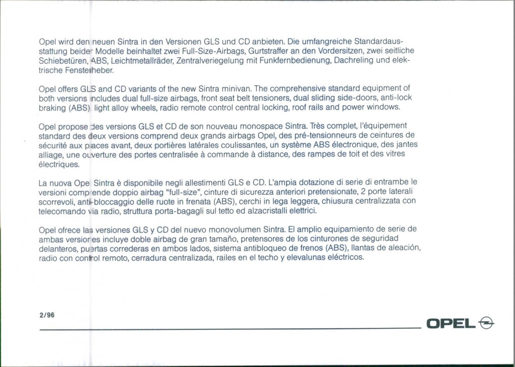 Opel will offer the new Sintra in the GLS and CD versions. The extensive standard equipment for both models includes two full-size airbags, seat belts in the front seats, two side sliding doors, ABS, alloy wheels, central locking with radio remote control, roof rails and electric windows. Opel offers GLS and CD variants of the new Sintra minivan. The comprehensive standard equipment of both versions includes dual full-size airbags, front seat belt tensioners, dual sliding side doors, anti-lock braking (ABS) light alloy wheels, radio remote control central locking, roof rails and power windows. Opel propose the versions GLS and CD de son nouveau monospace Sintra. Completely, the standard equipment for versions of the Grand Airbags Opel, the pre-tensioners of the security and auxiliary space, the doors of lateral coulissants, the ABS system electronics, the alliance, and the opening of the central office distance, the disaster to the point and the vitreous electrics. La nuova Open Sintra is available on all CDs and CDs. The full range of models in the series includes the full-size doppio airbag, cents of the anterior pretension, 2-port lateral scoroli, anti-blocaggio delle ruote in frenata (ABS), leggings in leggings, chiusura centralizzata con telecomando via radio, struttura porta-bagagli sul tetto and alzacristalli elettrici. Opel ofrece las versions GLS y CD del nuevo monovolumen Sintra. The amplifier is equipped with a series of ambient versions including dual airbags from the Gran Tamaño, pretensores de los cinturones de seguridad delanteros, several corridors and ambos lados, anti-lock system, ABS system, radio control system, radio control, rail and el techo y elevalunas eléctricos.