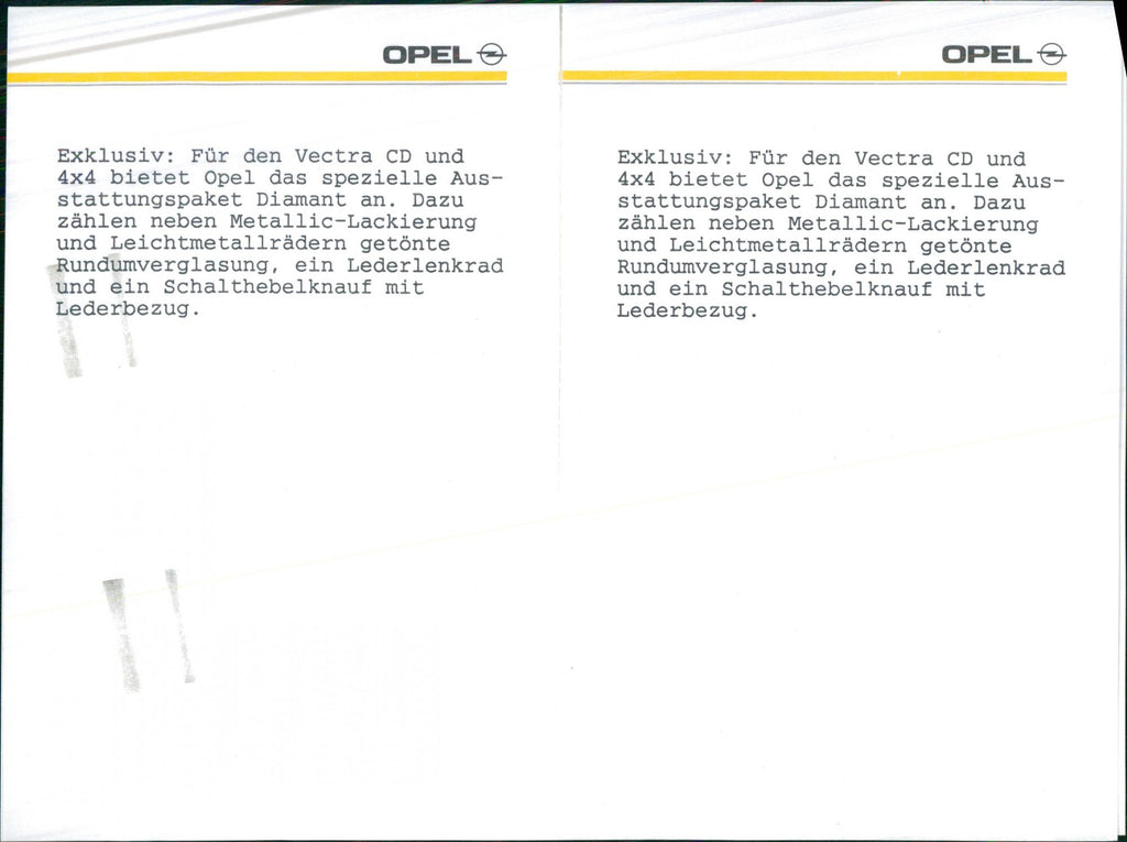 Exclusive: For the Vectra CD and 4x4, Opel offers the special equipment package Diamant. In addition to metallic paint and light-alloy wheels, this includes tinted all-round glazing, a leather steering wheel and a gear lever knob with leather cover.