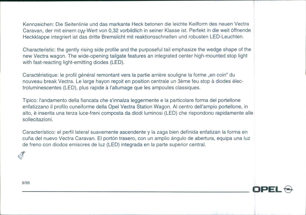 Characteristic: the gently rising side profile and the purposeful tail emphasize the wedge shape of the new Vectra wagon. The wide-opening tailgate features an integrated center high-mounted stop light with fast-reacting light-emitting diodes (LED).