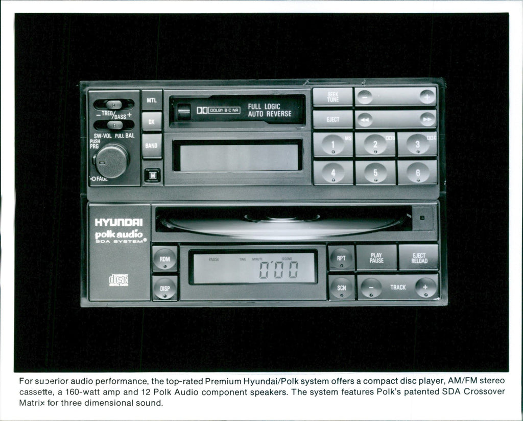 For superior audio performance, the top-rated Premium Hyundai/Polk system offers a compact disc player, AM/EM stereo cassette, a 160-watt amp and 12 Polk Audio component speakers. The system features Polk's patented SDA Crossover Matrix for three dimensional sound.