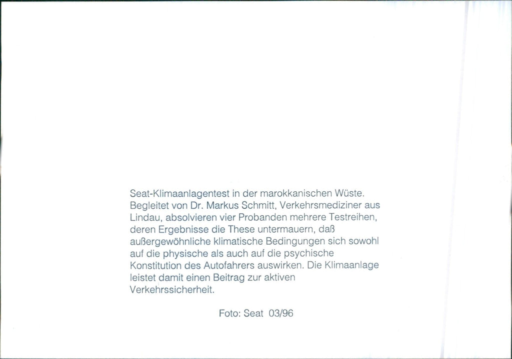 Seat air conditioning test in the Moroccan desert. Accompanied by Dr. Markus Schmitt, traffic physician from Lindau, completed four test series in a series of tests, the results of which support the thesis that exceptional climatic conditions affect both the physical and psychological constitution of the driver. The air conditioning system thus makes a contribution to active traffic safety.