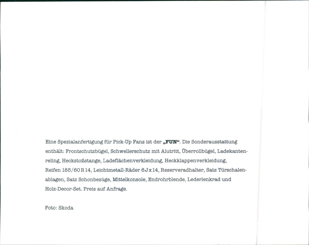 The "Fun" is a special production for pick-up fans. The special equipment includes: front protection bar, sill protection with aluminum steps, roll bar, loading sill rail, rear bumper, loading area trim, tailgate trim, tires 185 / 60R14, light alloy wheels 6JX14, spare wheel holder, set of door shell trays, set of protective covers, center console, tailpipe trim, leather steering wheel and wooden steering wheel decor set.