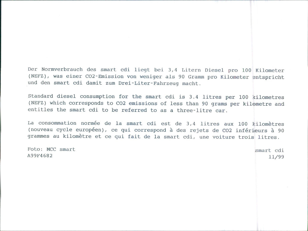 Standard diesel consumption for the smart cdi is 3.4 litres per 100 kilometres (NEFZ) which corresponds to CO2 emissions of less than 90 grams per kilometre and entitles the smart cdi to be referred to as a three-litre car.