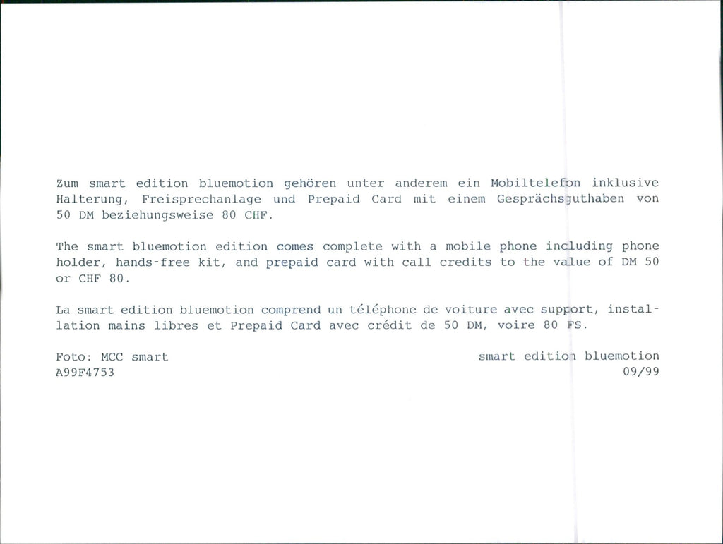 The Smart Edition Bluemotion comes complete with a mobile phone including phone holder, hands-free kit, and prepaid card with call credits to the value of DM 50 or CHF 80.