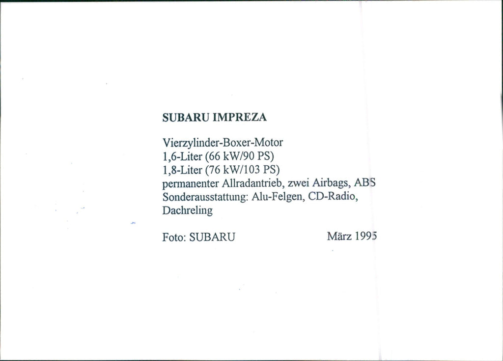 Subaru Impreza 1995 SUBARU IMPREZA four-cylinder boxer engine 1.6-liter (66 kW / 90 hp) 1.8-liter (76 kW / 103 hp) permanent all-wheel drive, two airbags, ABS Special equipment: aluminum rims, CD radio, roof rails Photo : SUBARU March 1995
