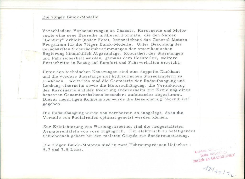 The 73er Buick models Various improvements to the chassis, body and engine as well as a new medium-sized series, which was given the name "Century" (our photo), characterize the General Motors program for the 73er Buick models.