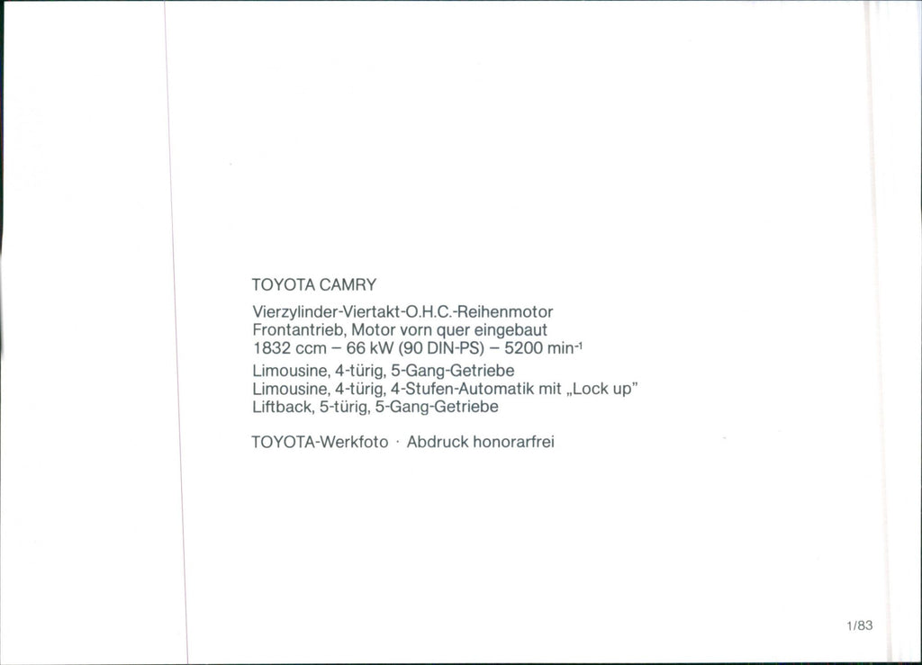 Toyota Camry, four cylinder and four stroke OHC inline engine, front-wheel drive, front engine installed transversely 1832 ccm - 66 kW (90 DIN-PS) - 5200 min-1 sedan, 4-door, 5-speed transmission sedan, 4-door, 4-stage Automatic with "lock up" liftback, 5-door, 5-speed transmission.