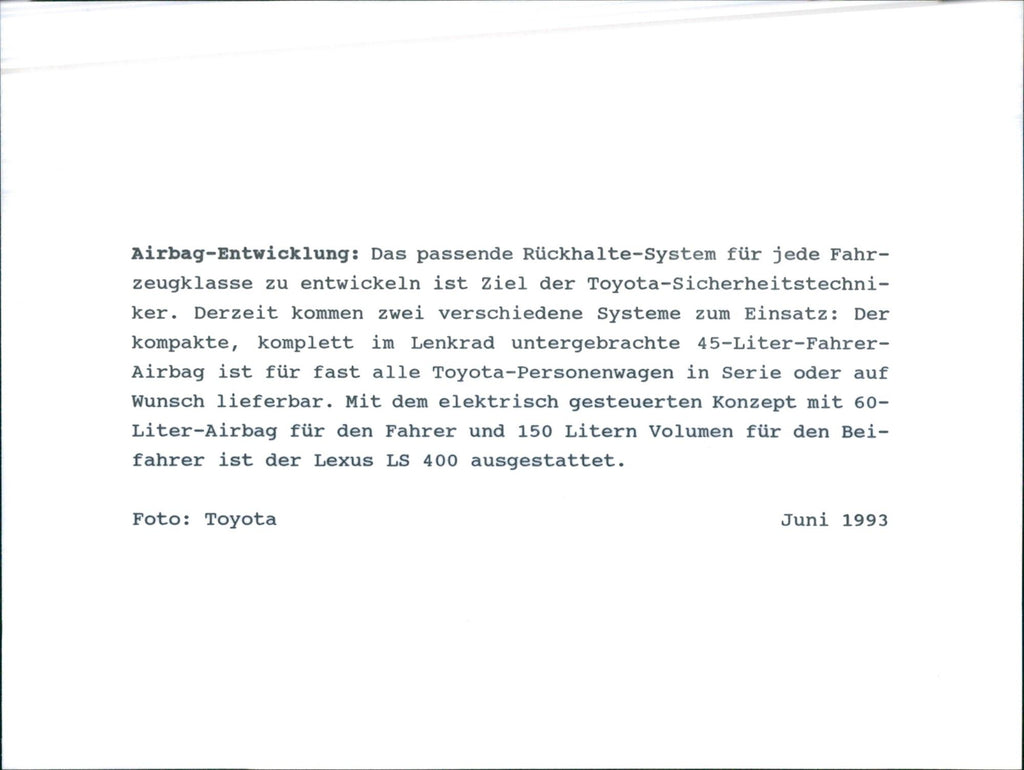 Airbag development: Toyota safety technicians aim to develop the right restraint system for every vehicle class. Two different systems are currently in use: the compact 45-liter driver airbag, which is completely housed in the steering wheel, is available for almost all Toyota passenger cars in series or on request. The Lexus LS 400 is equipped with the electrically controlled concept with 60 liter airbag for the driver and 150 liter volume for the passenger.