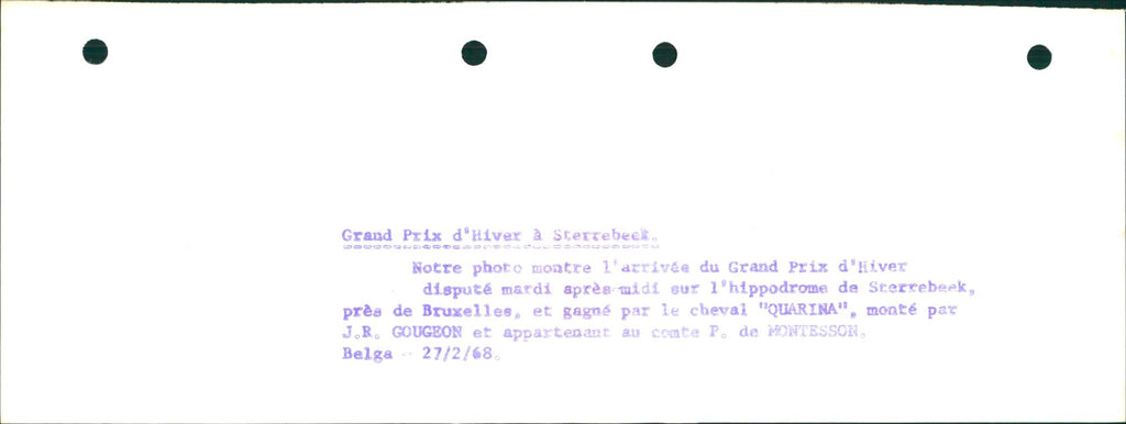 The arrival of the Winter Grand Prix at the Sterrebeek racecourse. The competition was won by Quarina, ridden by J.R. Gourgeon. The horse belongs to Count P. de Montesson.