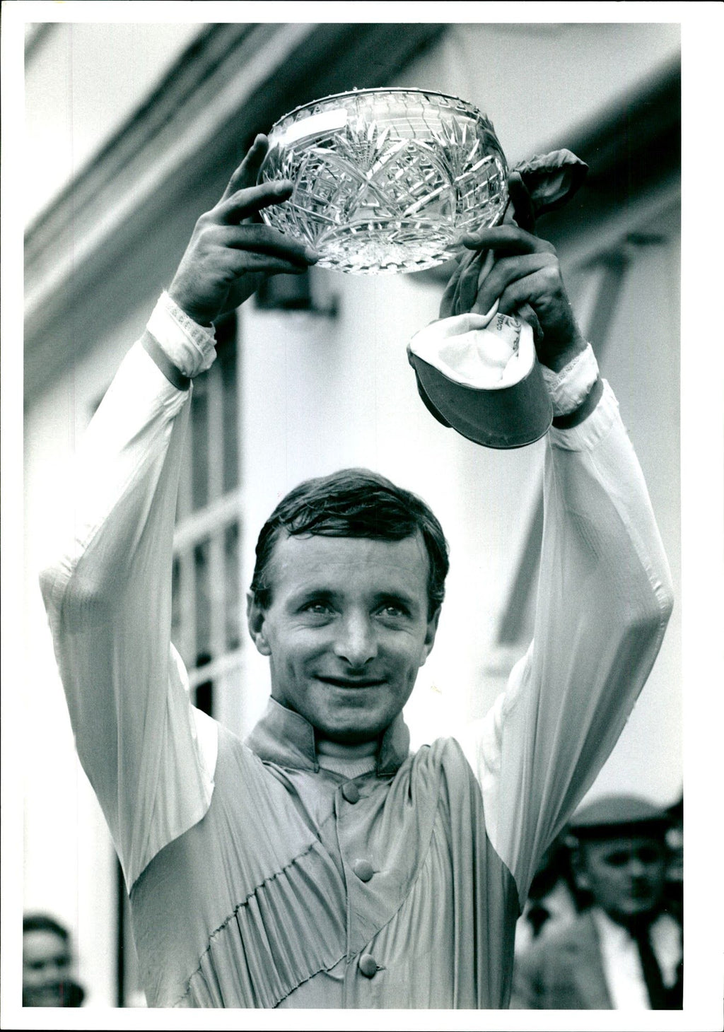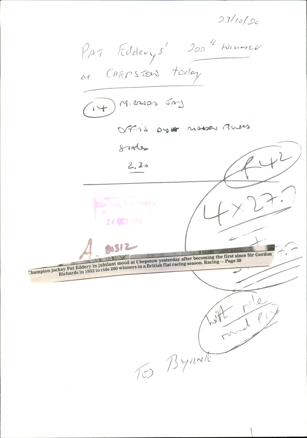 Champion jockey Pat Eddery in jubilant mood at Chepstow after becoming the first since Sir Gordon Richards in 1952 to ride 200 winners in a British flat racing season.