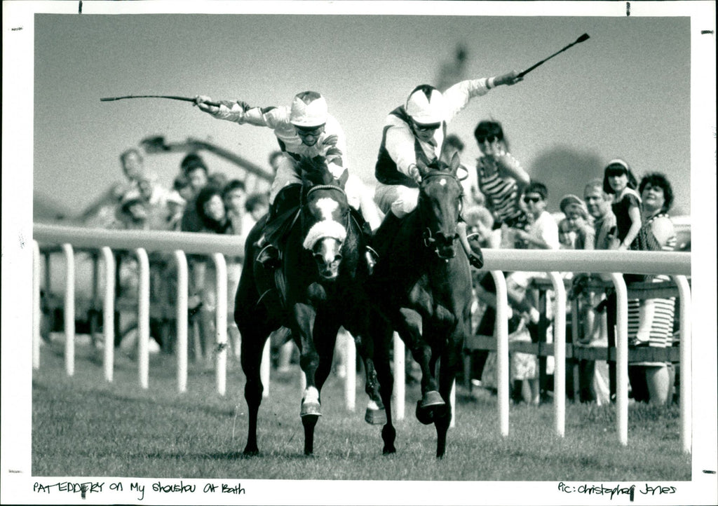 Front: Pat Eddery on My Shevshav at Bath. Pic: Christopher Jones. Back: 23 JUL 1991