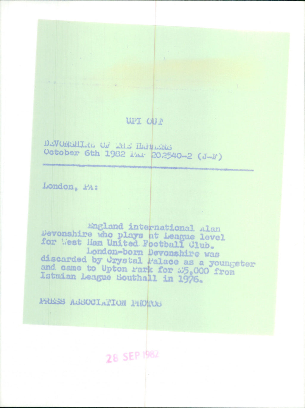 England international Alan Devonshire who plays at League level for West Ham United Football Club. London-born Devonshire was discarded by Crystal Palace as a youngster and came to Upton Park for £5,000 from Isthmian League Southall in 1976. England international Alan Devonshire who plays at League level for West Ham United Football Club. London-born Devonshire was discarded by Crystal Palace as a youngster and came to Upton Park for £5,000 from Isthmian League Southall in 1976.