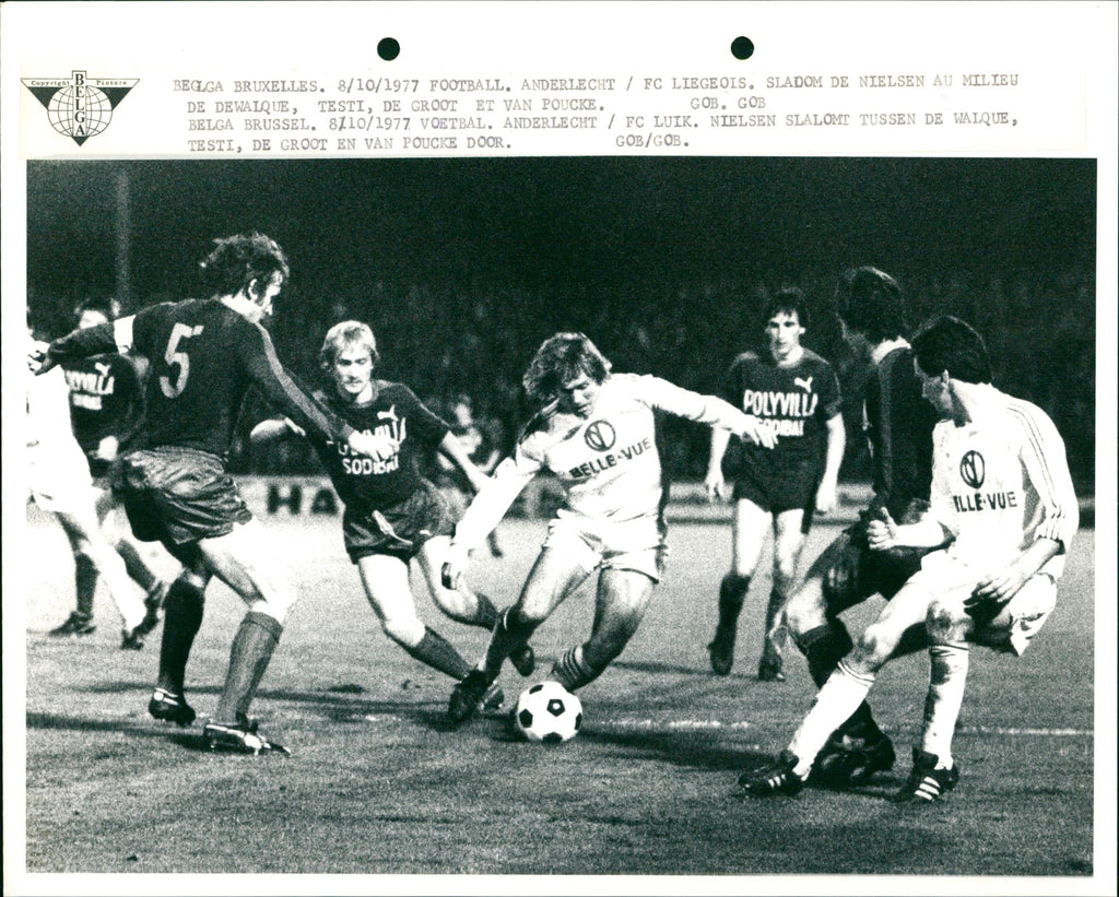 Belgian football duel opposing the clubs of Anderlecht and FC Liegois - Nielsen dribbels in between De Walque, Testi, De Groot and Poucke