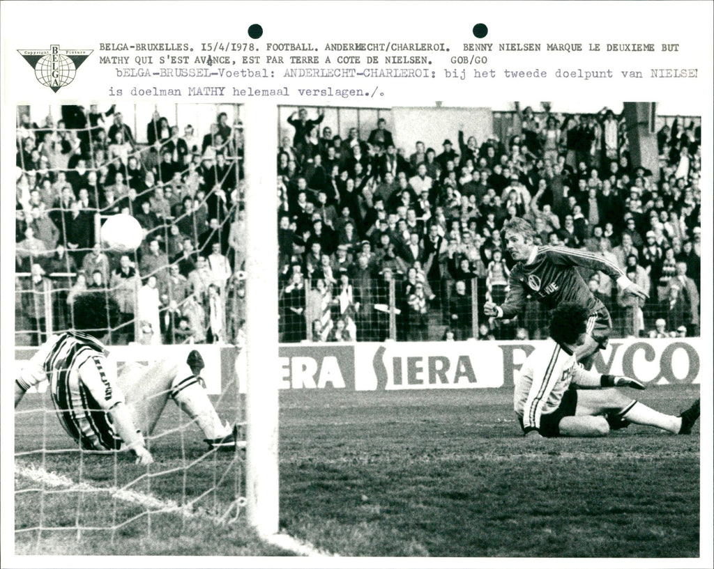 Football match Anderlecht - Charleroi: Benny Nielsen marks the second goal. The goalkeeper Mathy moved forward and hits the ground near Nielsen.