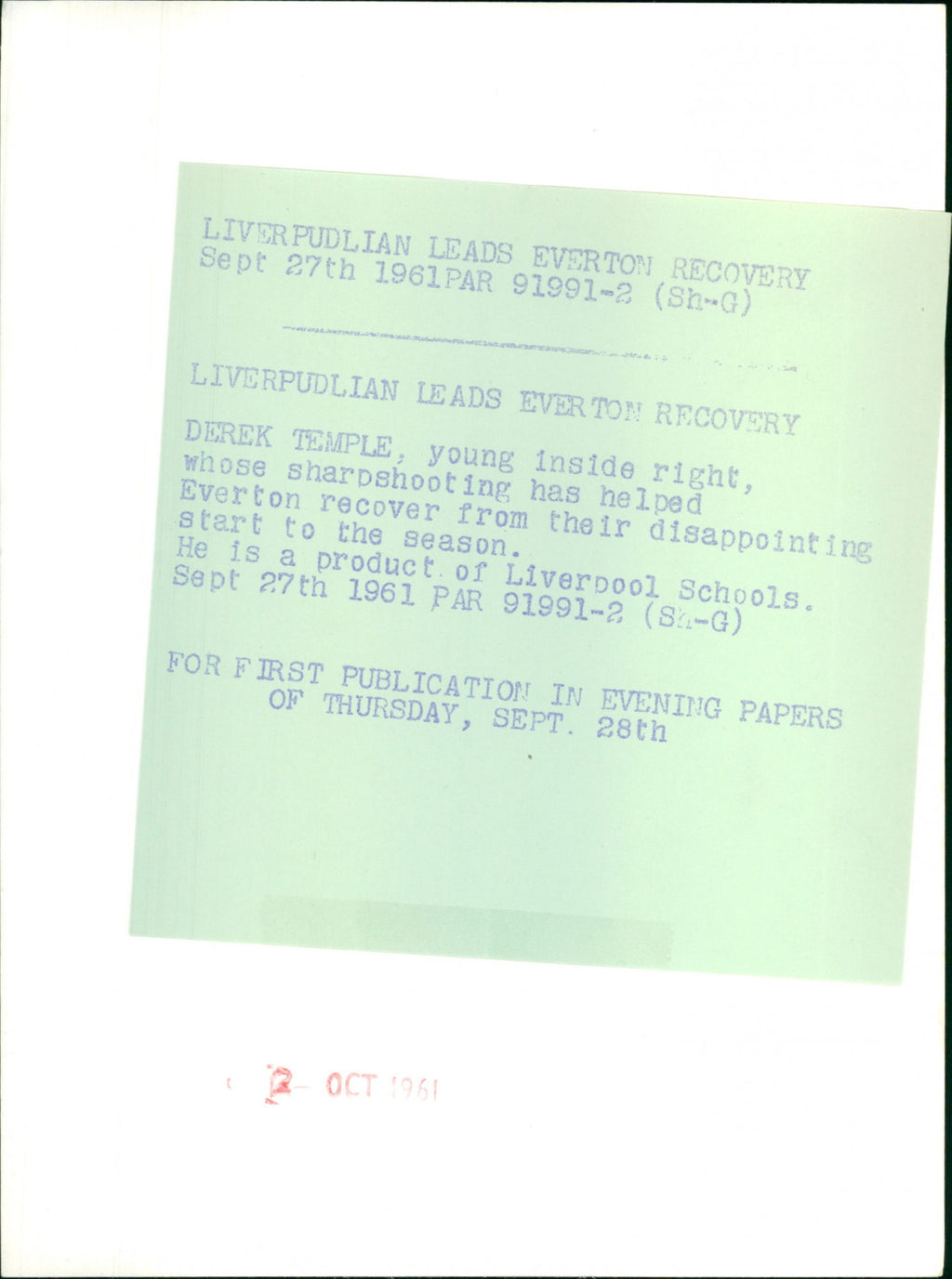 Derek Temple, inside-right, whose sharpshooting has helped Everton recover from their disappointing start to the season. He is a product of Liverpool Schools. Derek Temple, inside-right, whose sharpshooting has helped Everton recover from their disappointing start to the season. He is a product of Liverpool Schools.