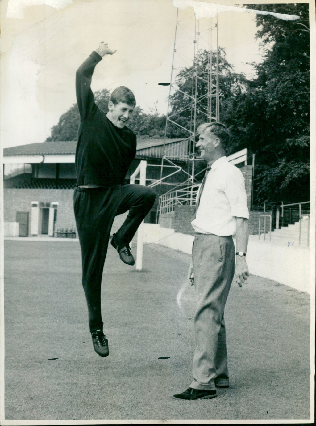 Footballer Jim Barron demonstrating his high jump move. Footballer Jim Barron demonstrating his high jump move.