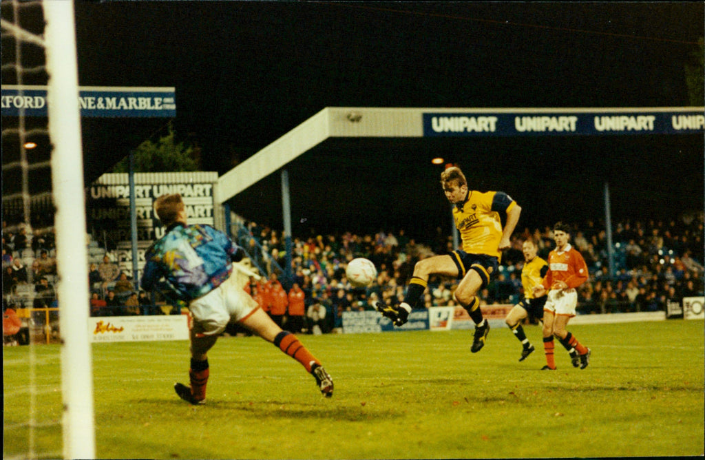 Oxford United striker John Byrne has a go at goal. Oxford United striker John Byrne has a go at goal.