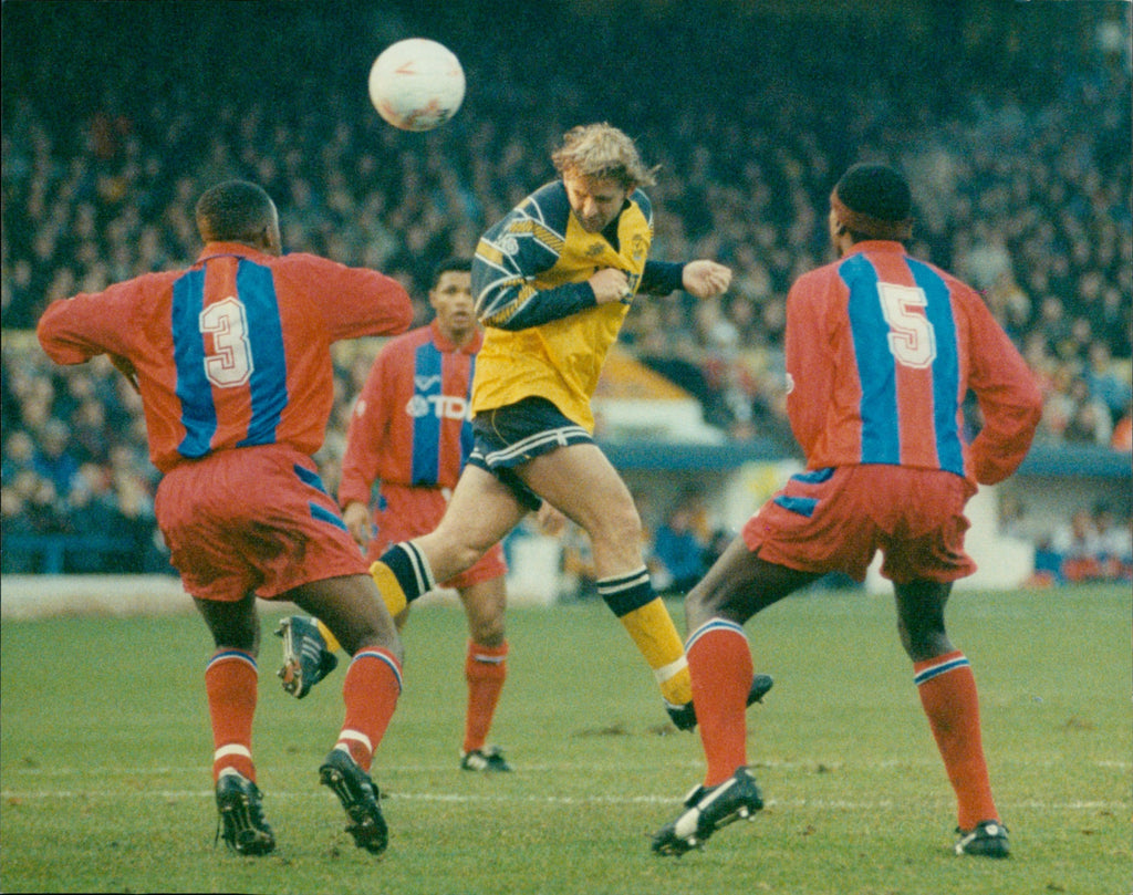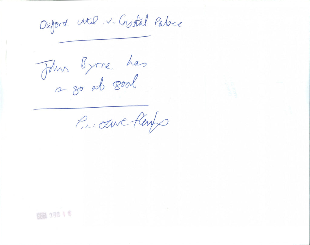 Oxford United vs. Crystal Palace. John Byrne has a go at goal. Oxford United vs. Crystal Palace. John Byrne has a go at goal.