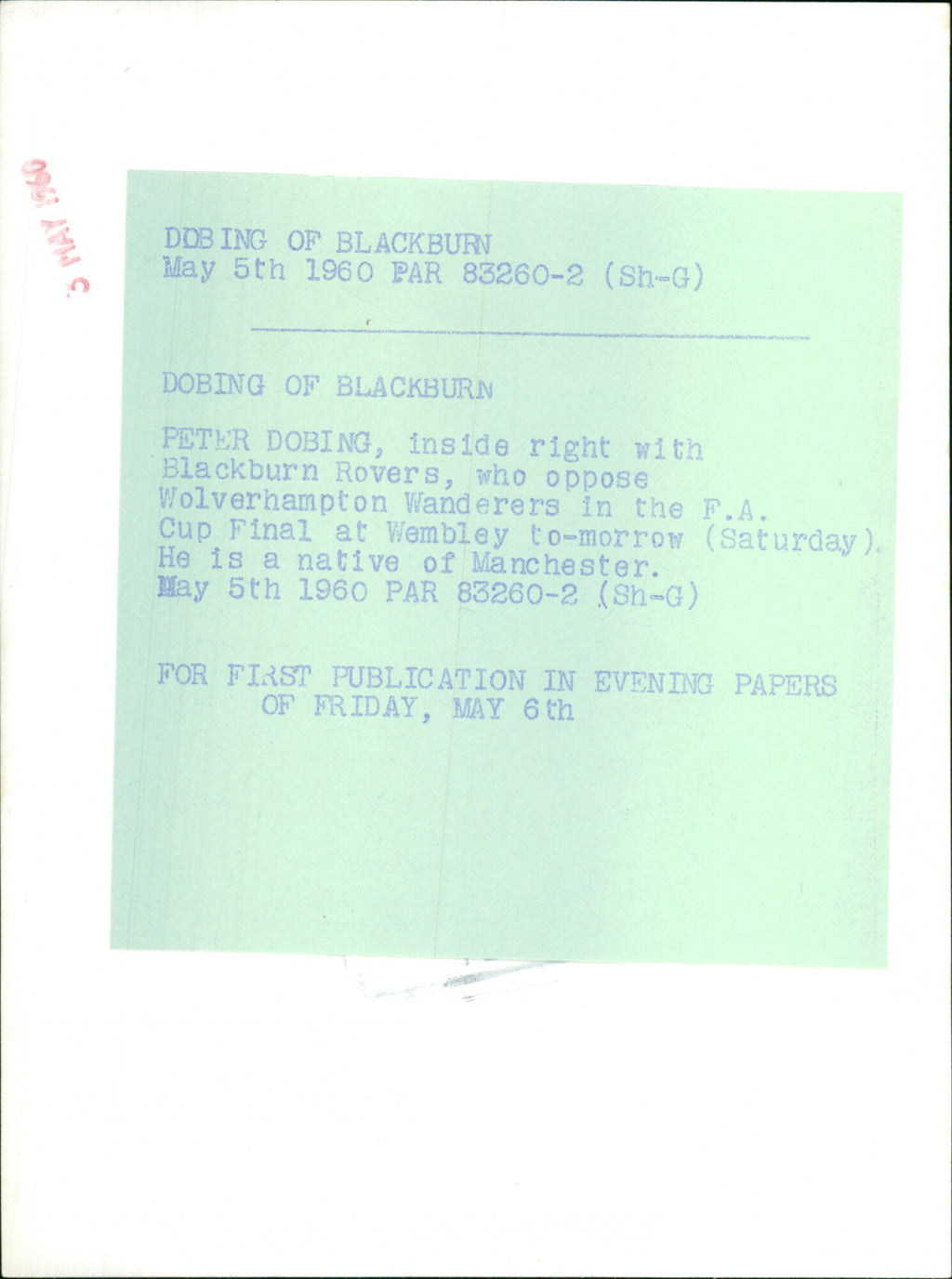 Peter Dobing inside right with Blackburn Rovers who oppose Wolverhampton Wanderers in the FA Cup Final at Wembley. He is a native of Manchester. Peter Dobing inside right with Blackburn Rovers who oppose Wolverhampton Wanderers in the FA Cup Final at Wembley. He is a native of Manchester.