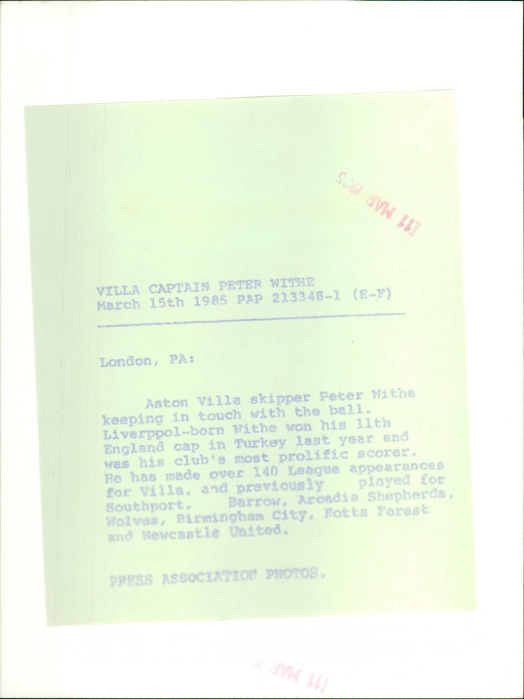 Aston Villa skipper Peter Withe keeping in touch with the ball. Liverpool-born Withe won his 11th England cap in Turkey and was his club's most prolific scorer. He has made over 140 League appearances for Villa and previously played for Southport, Barrow, Arcadis Shepherds, Wolves, Birmingham City, Notts Forest and Newcastle United. Aston Villa skipper Peter Withe keeping in touch with the ball. Liverpool-born Withe won his 11th England cap in Turkey and was his club's most prolific scorer. He has made over 140 League appearances for Villa and previously played for Southport, Barrow, Arcadis Shepherds, Wolves, Birmingham City, Notts Forest and Newcastle United.