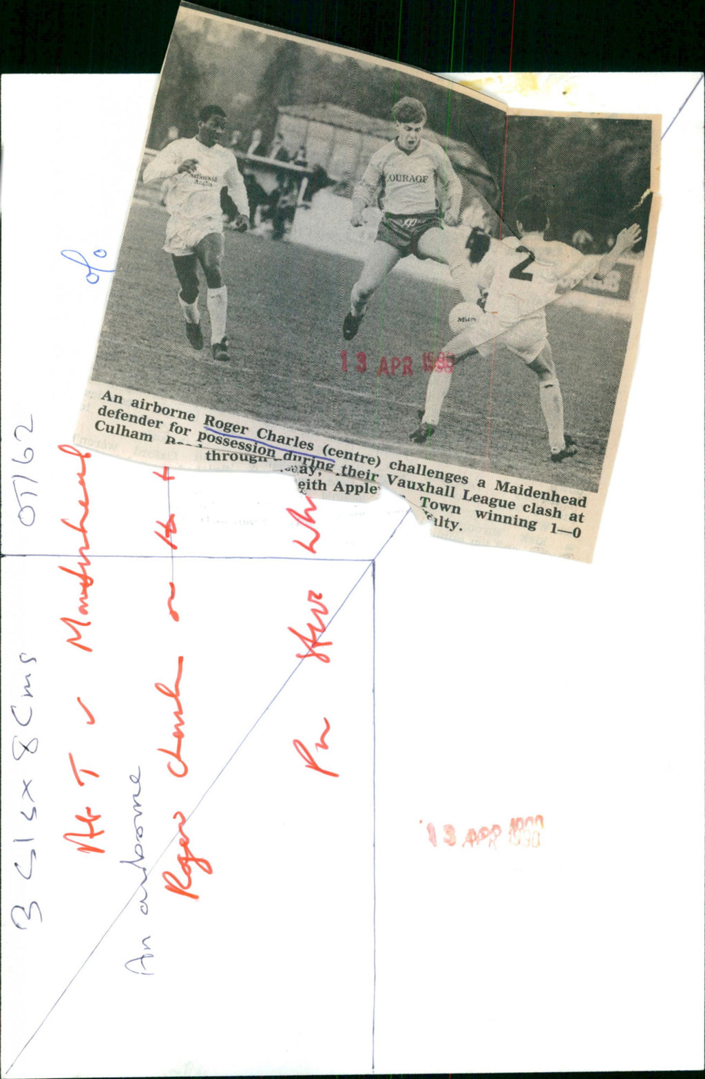 Abingdon Town vs. Maidenhead. An airborne Roger Charles (center) challenges a Maidenhead defender for possession during their Vauxhall League clash at Culham. Abingdon Town vs. Maidenhead. An airborne Roger Charles (center) challenges a Maidenhead defender for possession during their Vauxhall League clash at Culham.
