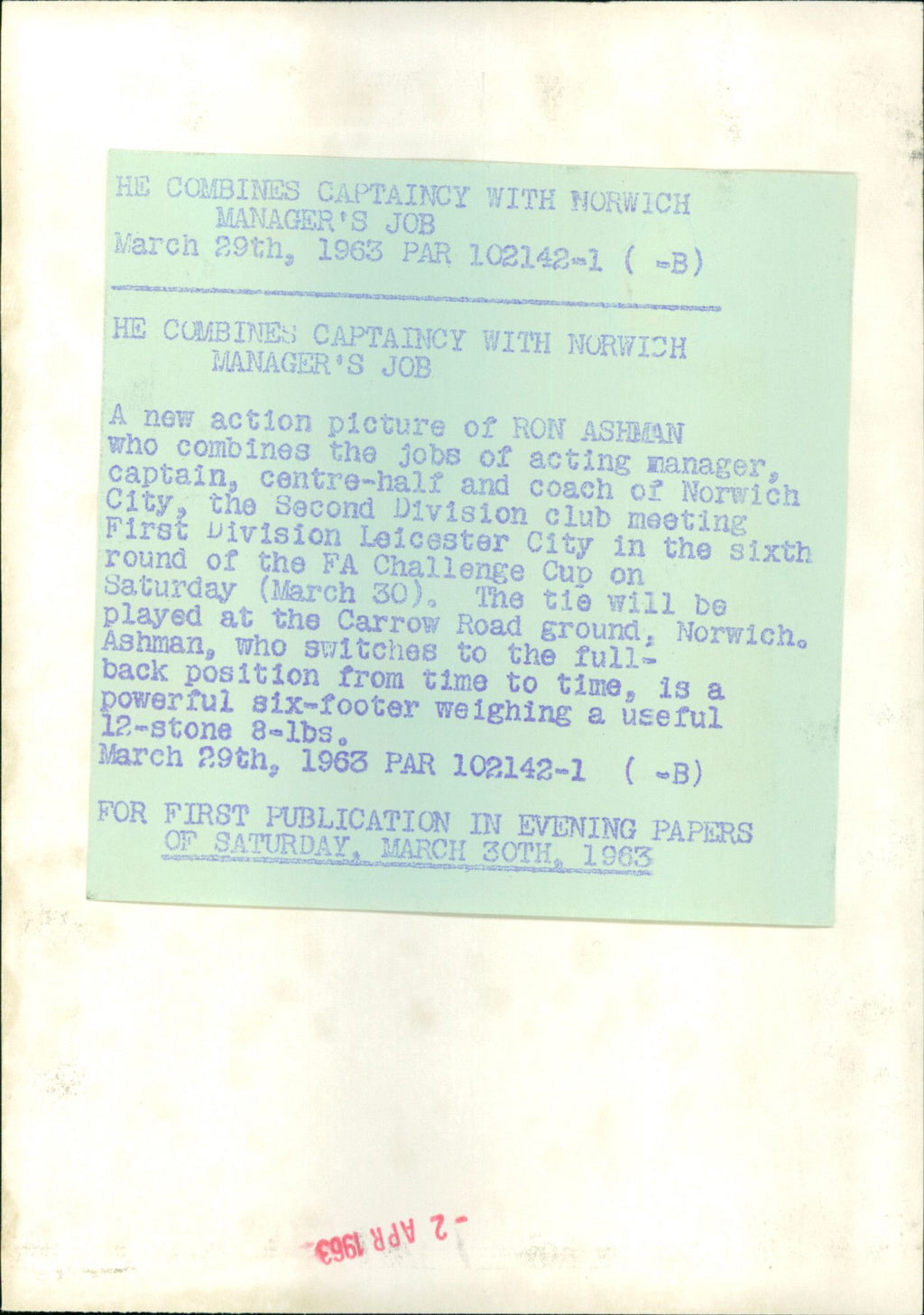 Action picture of Ron Ashman who combines the jobs of acting manager captain, center-half and coach of Norwich City. Action picture of Ron Ashman who combines the jobs of acting manager captain, center-half and coach of Norwich City.