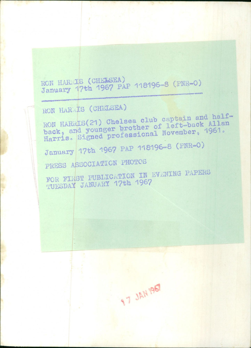 Ron Harris, Chelsea club captain and half-back and younger brother of left-back Allan Harris. Ron Harris, Chelsea club captain and half-back and younger brother of left-back Allan Harris.