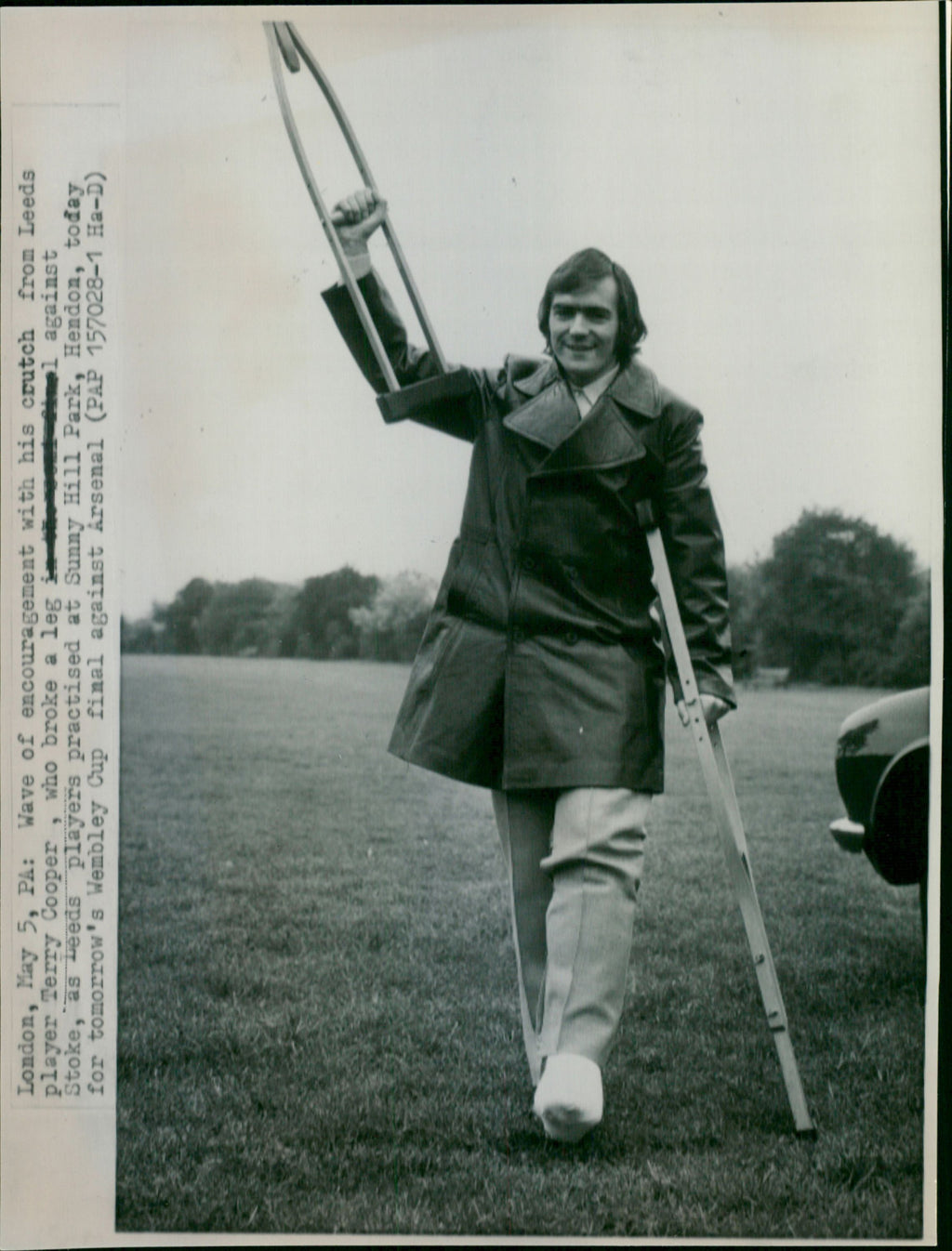 Wave of encouragement with his crutch from Leeds player Terry Cooper, who broke a leg against Stoke as Leeds players practiced at Sunny Hill Park, Hendon for Wembley Cup final against Arsenal. Wave of encouragement with his crutch from Leeds player Terry Cooper, who broke a leg against Stoke as Leeds players practiced at Sunny Hill Park, Hendon for Wembley Cup final against Arsenal.