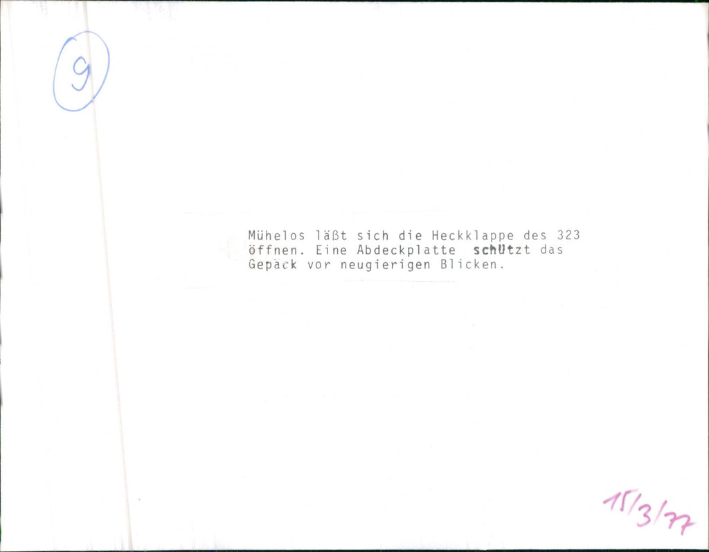 1977 Mazda 323, the 323's tailgate can be opened effortlessly. A cover plate protects the luggage from prying eyes.