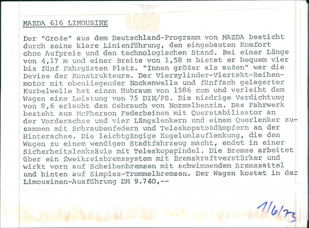 The "Big One" from the Germany program by MAZDA impresses with its clear lines, the built-in comfort at no extra charge and the technological status. With a length of 4.17 m and a width of 1.58 m, it comfortably offers four up to five passengers. The designers' motto was "bigger inside than outside". The four-cylinder four-stroke in-line engine with overhead camshaft and five-bearing crankshaft has a displacement of 1586 ccm and gives the car an output of 75 DIN / PS. The low compression of 8.6 allows the use of regular gasoline. The chassis consists of McPherson struts with anti-roll bar on the front axle and four trailing arms and a wishbone together with coil springs and telescopic shock absorbers on the rear axle. The smooth-running recirculating ball steering, which turns the car into an agile city vehicle, ends in a safety steering column with a telescopic spindle. The brake works via a dual-circuit brake system with a brake booster and acts on disc brakes with a floating brake caliper at the front and on simplex drum brakes at the rear. The limousine version of the car costs DM 9,740
