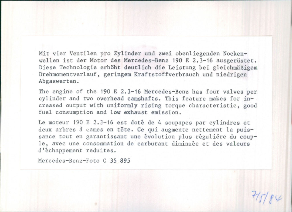 The engine of the 190E 2.3-16 Mercedes-Benz has four valves per cylinder and two overhead camshafts. This feature makes for increased output with uniformly rising torque characteristics, good fuel consumption, and low exhaust emission.